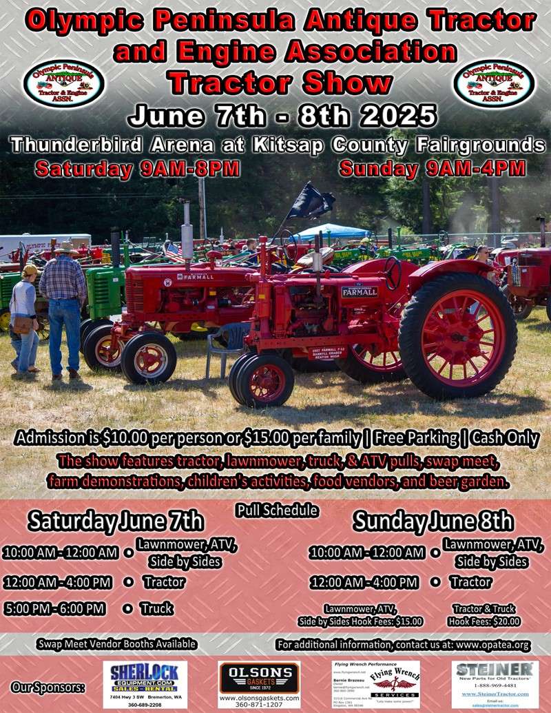 The annual Tractor Show will be held on June 7th & 8th 2025 at the Thunderbird Arena at the Kitsap County Fairgrounds.